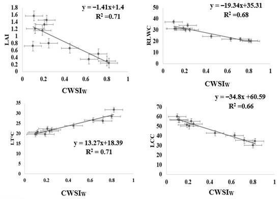 Relationship between CWSIW, leaf temperature, Leaf Area Index, Leaf Chlorophyll Content, and Relative Leaf Water Content obtained from the various treatments.