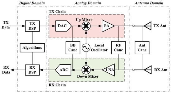 A fundamental challenge to IBFD systems is self-interference (SI), which is the signal received by a receiver from a collocated transmitter []. SI is typically much stronger than the signal received from an intended distant transmitter. Since the SI in an IBFD system occupies the same frequency band but has much higher power than the desired signal, it must be cancelled first in order for any receiver to operate. To enable an IBFD operation, one would need to sufficiently reduce the SI to below the noise floor ideally. As Figure 1 shows, the SI power is basically determined by the transmit power and receiver noise floor and it can be anywhere between 90 and 120 dB (a billion to a trillion times) more powerful than the signal of interest (SOI) depending on the applications. For example, if the transmit power level is + 20 dBm and the thermal noise floor of the receiver is −90 dBm, the SI should be suppressed by 110 dB. This powerful SI is tremendously sensitive to the frequency selectivity, time variance, nonlinear distortion, and phase noise and these challenges are further exacerbated when integrated implementations targeting cost-sensitive and form-factor-constrained mobile devices are considered [].