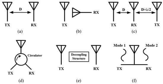 Passive SIC techniques in the AP domain. (a) Antenna separation. (b) Polarization orthogonality. (c) Near-field cancellation. (d) Isolation feed network. (e) Decoupling surface/structure. (f) Orthogonal antenna modes.