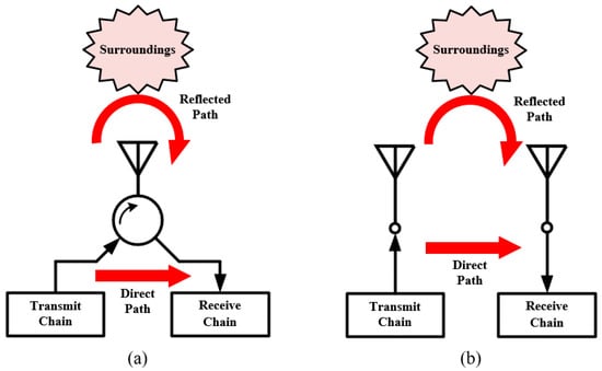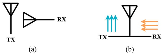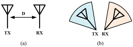 where L is the path loss in decibels, d is the distance between the TX and RX antennas, and λ is the wavelength in free space []. Although increasing the distance can surely improve the isolation between the antennas, the merit is limited, e.g., the path loss is only increased by 6 dB when the distance is doubled. Another more efficient method to “separate” the TX and RX antennas is to direct their radiation beams into different directions (directional separation), as shown in Figure 4b, leading to a weaker coupling despite the relatively closer distance between them.