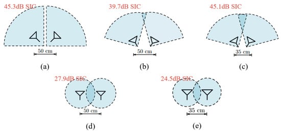 Five configurations of antenna separation with their SIC performance investigated in []. (a) 90° directional separation with 50 cm spatial separation. (b) 60° beam separation with 50 cm antenna separation. (c) 60° beam separation with 35 cm antenna separation. (d) 50 cm antenna separation. (e) 35 cm antenna separation. Note the antennas in (a–c) have 90° beamwidth and the antennas in (d–e) are omnidirectional.