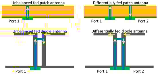 Illustration of unbalanced fed and differentially fed patch and dipole antennas.