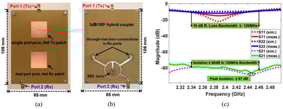 As shown in Figure 9d, near-field cancellation can also be achieved by using two pairs of circular-polarized antenna elements []. Because of the anti-phase input signal of the two differential feed ports, there exists a near-field radiation null at the symmetric axis of the two ports of a differentially fed antenna. By placing the RX (TX) antenna at the symmetric axis of the TX (RX) antenna, near-field cancellation can be realized.