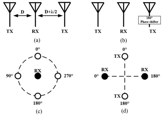 Near-field cancellation in four configurations. (a) λ/2 distance difference between transmitting (TX) antennas. (b) 180°phase difference between TXs. (c) Circular TX array with gradient phases. (d) TX and receiving (RX) antenna pairs with differential feeding.