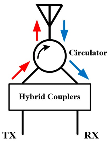 IBFD communication has widespread applications in the wireless realm. For civilian applications, it is considered for wireless local area network (WLAN) systems [], radio frequency identification (RFID) readers [], vehicle-to-vehicle (V2V) communications [], wireless data and power transmission systems [], etc. Besides, combined with relaying and multiple-input-multiple-output (MIMO) technologies, IBFD relay systems [,] and MIMO systems [,], which further improve the capacity of systems, are appropriate candidates for solving data congestion in wireless communication in 5G and beyond. IBFD is also in high demand in military applications such as electronic warfare systems, where it offers the possibility to monitor weak signals and simultaneously introduce jamming signals in the channel to improve security [,].