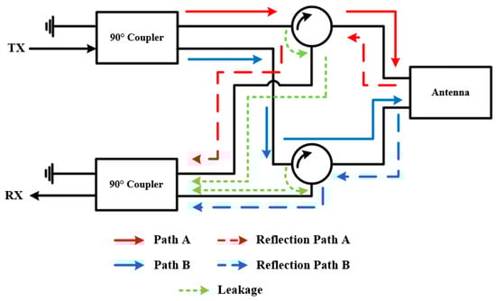 As an example, Figure 12 shows the isolation feed network proposed in [] to achieve IBFD communication. The 90° coupler connected to the TX port, which is able to provide ± 90° phase difference between two output ports, will separate the TX signal into two signal paths, i.e., path A and path B with 90° phase difference. In ideal conditions, all the input signals will enter the antenna as shown by the red and blue solid lines. However, in practice, the refection signal caused by antenna mismatching (as shown by the red and blue dash lines) and the leakage signals (as shown by the green dot lines) of circulators cannot be neglected. These signals will reach the RX port through another 90° coupler, which makes a total 180° phase difference for the two reflection signals and the two leakage signals. They will eventually cancel out at the RX port, making the isolation between the two ports remains at a high level.