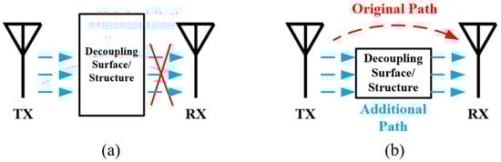 There has been intensive research for many years to reduce antenna decoupling. Among the available methods, decoupling structures that are placed between two closely spaced antennas serve as good candidates for IBFD antenna systems. As illustrated in Figure 13a, one kind of the decoupling structure acts as a band-stop filter, which can block the coupling wave at the operation bandwidth. Examples based on this mechanism include defected ground structure (DGS) [], wave trap structure (WTS) [,], high impedance surface (HIS) [,], frequency selective surface (FSS) [,], electromagnetic band gap (EBG) [,] and so on. The other kind of decoupling structures like resonant baffles [,], antenna decoupling surface (ADS) [] and neutralization line (NL) [,] can introduce an additional coupling path whose phase is set opposite to the original coupling path, thus the coupling of two paths cancels out, as shown in Figure 13b. In addition, some studies [,] prove that electromagnetic absorbing materials, which are basically composed of dielectric substrate with high loss tangents, are also able to improve the isolation by absorbing the coupling energy.