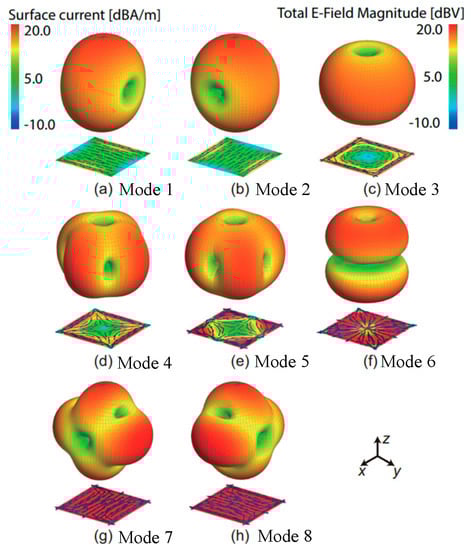 At last, there are also a few examples of achieving SIC by exciting a pair of orthogonal characteristic modes on one antenna with different feed positions. For example, as shown in Figure 14, reference [] presents the current distributions and radiation patterns of seven modes of a patch antenna. By exciting the two dominant characteristic modes with orthogonal polarizations, i.e., mode 1 and mode 2, an isolation of more than 30 dB between the two modes is achieved. It is also proved capable of exciting two characteristic modes with the same polarization, i.e., mode 2 and mode 7, to attain an isolation of 58 dB at 2.4 GHz. However, it’s worth to mention that the radiation patterns of the two modes are different. This technique is also used in chassis-mode mobile MIMO antennas to excite two orthogonal characteristic modes, thus improving the isolation to about 21 dB in []. Besides, in [], the microstrip-coupled coplanar waveguide (CPW) is used at the TX port to excite a stepped-slot antenna in the CPW odd mode. On the opposite side of the antenna, a microstrip T-junction power divider is employed at the RX port to feed two offset-fed stepped-slot antennas in even mode, achieving more than 50 dB isolation. In [], by exploring a shared aperture cavity-like structure with two highly orthogonal modes (quarter-wavelength slot mode and half-mode cavity mode), high isolation of 43 dB between TX and RX ports is achieved. In recent IBFD designs [,], the technique based on common-mode and differential-mode cancellation is also proved feasible to realize high isolations between co-polarized antennas.
