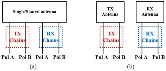 Two kinds of IBFD antenna with two polarizations in TX and RX chains. (a) Single/Shared antenna. (b) Multiple antennas.