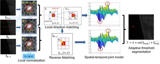 The local spatial–temporal matching detection method (LSM) is suitable for the IR image sequence obtained by a space-based platform under staring imaging mode. LSM consists of five steps: local normalization, local direction matching, spatial–temporal joint model, reverse matching, and adaptive threshold segmentation. The details of LSM are elaborated in this section, and an overview is given in Figure 2.