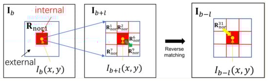 After obtaining , reverse matching is added into LSM. As shown in Figure 3, at , if the offset from and is in the direction indicated by the green arrow, the offset from and is in the direction indicated by the yellow arrow in Figure 3, and is another reference frame. In this case, the local backgrounds in and can be reverse-matched. At in , the offsets of local background from to can be determined by: