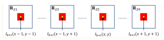 where represents frame interval, and represents the matching radius determined by practical engineering tasks. In our work, is set to 1; the range of is illustrated in Figure 2 and Figure 3. Then nine slices with the same dimension as are extracted and named . The positions of s are further illustrated in Figure 4, and the yellow points are the centers of s.