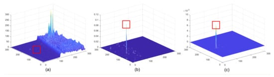 | Input: Base frame , reference frames and . Output: The position of the aerial target. (1) Obtain the size of . (2) for do (3) for do (4) Obtain the local slices and s by Equations (1) and (2); (5) Obtain the normalized slices and s by Equations (3) and (4); (6) Calculate the matching coefficient r1(x,y) and determine the by Equations (5)–(7); (7) Construct the spatial–temporal joint model between and and calculate by Equations (8)–(14); (8) Conduct reverse matching and obtain by Equations (15)–(17); (9) Calculate the normalized slice of by Equation (3); (10) Calculate the matching coefficient by Equation (5); (11) Construct the spatial–temporal joint model between and and calculate by Equations (8)–(14); (12) Calculate the saliency map value by Equations (18) and (19); (13) end for (14) end for (15) Obtain the saliency map ; (16) Calculate the adaptive threshold by formula Equation (20); (17) Output the position of the aerial target. |
