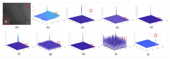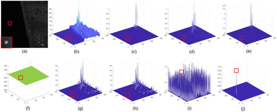 Detection results of different methods in Seq.2. (a) raw image, the details of target are magnified at the left bottom corner; (b) three-view of raw image; (c) result of STLCM; (d) result of STLCF; (e) result of FSM; (f) result of NSM; (g) result of STJP; (h) result of DNGM; (i) result of MLTC; (j) result of LSM.