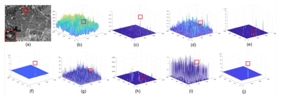Detection results of different methods in Seq.4. (a) raw image, the details of target are magnified at the left bottom corner; (b) three-view of raw image; (c) result of STLCM; (d) result of STLCF; (e) result of FSM; (f) result of NSM; (g) result of STJP; (h) result of DNGM; (i) result of MLTC; (j) result of LSM.