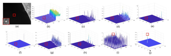 where and are standard deviations of the processed and raw image, respectively. GSCR is the index used to evaluate the target enhancement performance. The GSCR is calculated by: