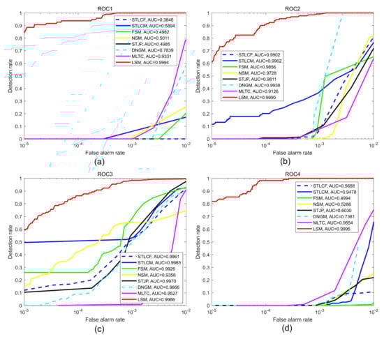 where is the number of real targets detected by the method, is the total number of real targets, is the number of targets falsely detected, and is the number of pixels. To visualize the detection effectiveness, a receiver operating characteristic curve (ROC) was drawn according to the relationship between and . The area under the ROC curve is represented by AUC.