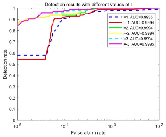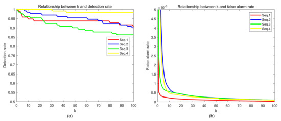 The segmentation parameter directly influences the detection effectiveness; the relationships between and detection results are shown in Figure 12. With the increase in the , both detection rate and false alarm rate decrease. The detection rate of different experimental sequences showed similar trends, and the detection rates could be maintained above 90% when . The variation trends of the false alarm rates of the five test sequences are nearly the same as well. When , the false alarm rates of all the sequences are less than . In order to maintain the detection rate and false alarm rate , the value range of in this method is recommended to be , which was given in Section 2.5.