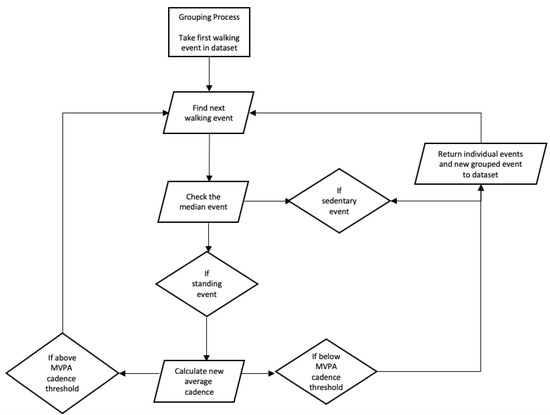 The grouping process may also be useful for assessing impaired walking populations where it would not be appropriate to use the same MVPA threshold used for a healthy nonimpaired population. For example, it has been shown that people with intermittent claudication walk with a slower cadence than matched healthy controls [32], and perhaps the chosen cadence threshold should be altered to enable this population to engage in continuous walking. The method presented provides a simple way of combining walking events based on the cadence threshold suitable for different populations, and future work should aim to derive these cadence thresholds and establish their impact on health outcomes.