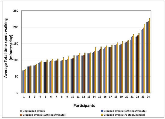 The average time spent walking before grouping (123.1 ± 35.8 min) was less than the average time spent walking after grouping at all defined cadence thresholds. The average time walking using the 76 steps/min (132.7 ± 38.3 min) was greater than the average time spent walking using the 100 steps/min threshold (126.3 ± 37.2 min) and the 109 steps/min threshold (124.7 ± 36.6 min) (Figure 3). Figure 3 presents the average time spent walking for all participants in increasing order according to the ungrouped events. After grouping, the average time spent walking increased by 8% for the 76 steps/min threshold, 3% for the 100 steps/min threshold, and 1% for the 109 steps/min threshold. All the changes were significant (F (1.5, 36.1) = 123.6, p < 0.05), and the post hoc pairwise comparisons using the Tukey test showed significant differences between all the datasets (p < 0.05).
