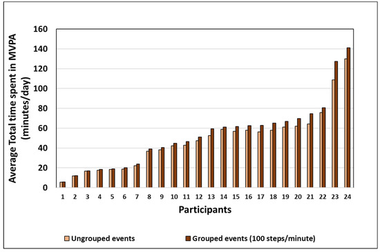 Comparing the participants’ activity levels against the 2011 physical activity guidelines where at least 30 min of MVPA per day and a minimum bout length of 10 min or more is stipulated (MVPA defined as ≥100 steps/min), only seven participants were compliant with the guidelines before grouping; however, after grouping, seven additional participants met the guidelines. With the 2019 guidelines (at least 30 min of MVPA per day on five days a week, with no restriction of bout lengths), there were 17 participants before grouping, with an additional three meeting the guidelines after grouping.