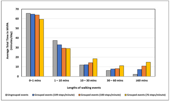 The average daily walking duration for the ungrouped (original walking events without interruptions) and three grouped walking event datasets (76, 100, and 109 steps/min) were compared using a repeated measure one-way ANOVA. Means, standard deviations, and percentage increases are presented along with significance level, with significance taken as p < 0.05. An analysis of MVPA was conducted for each of the three MVPA cadence thresholds: the average daily time spent in MVPA was calculated using the three cadence thresholds before and after grouping. The defined cadence threshold used for the grouping was also the threshold used to define MVPA. These data were analysed using a repeated measures two-way ANOVA to understand the effects of grouping and MVPA threshold on time spent in MVPA. The composition of the walking events within each of the datasets was analysed by data categorising the walking events into different lengths of walking events based on their total duration. Furthermore, the grouped walking events’ composition was analysed by categorising the original events that made up the grouped events into standing, walking events shorter than the total minimum value of the event bin, and walking events within the same range duration as the event bin. This showed the composition of the new grouped event in terms of standing time, short walking time, and longer walking time.