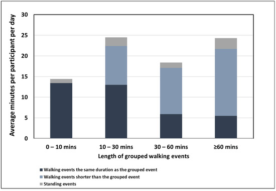 Figure 6 shows the composition of the grouped walking events using the 100 steps/min defined cadence threshold for four different lengths of walking events. The shorter walking duration of <10 min was exclusively made up of walking events equal to this duration and short standing events; no events shorter than this duration were included as this was the smallest possible duration range. As the duration of walking event length increased, the distribution of walking events that make up the event length shifted predominantly from events of the same duration to events shorter than the duration. This shows that the longer walking duration is predominantly made up of shorter events and highlights the influence of the grouping process on these bout lengths that would be considered continuous walking (≥10 min).
