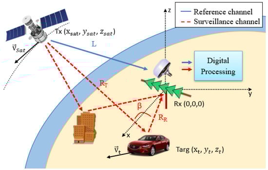 The basic geometry of a PR based on a space-borne IoO is depicted in Figure 1. The acquisition system is usually composed of two independent channels: one is the reference channel, for acquiring the direct signal from the satellite, ; and the other is the surveillance channel, in charge of recording target echoes from the AoI, .