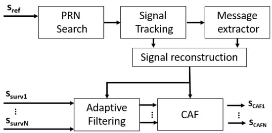 Before CAF generation, direct path interference components from all available satellites are filtered in the surveillance signals acquired by the different single radiating elements of the surveillance antenna array, using ECA filters [19].
