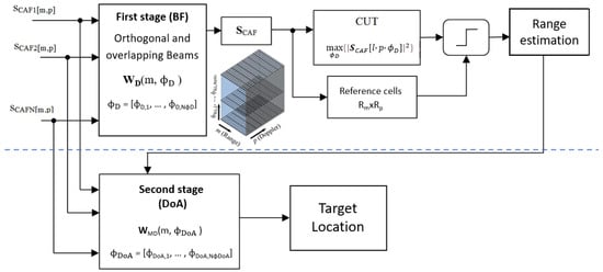 The functional block of the proposed processing scheme is depicted in Figure 3 where two block groups can be differentiated: the first part of the scheme carries out target detection and parameters estimation in the bistatic domain taking into consideration the beamforming gain of conventional beamforming techniques applied to the RDMs of the individual antennas; on the second part high accuracy DoA techniques are applied to provide targets azimuth estimations and allow accurate target location in Cartesian space. The computation of individual CAFs, which are required as input for this processing scheme, has already been considered in Section 2.2, while the two-stage digital array processing and the target detection and localization algorithms are presented in the following subsections.