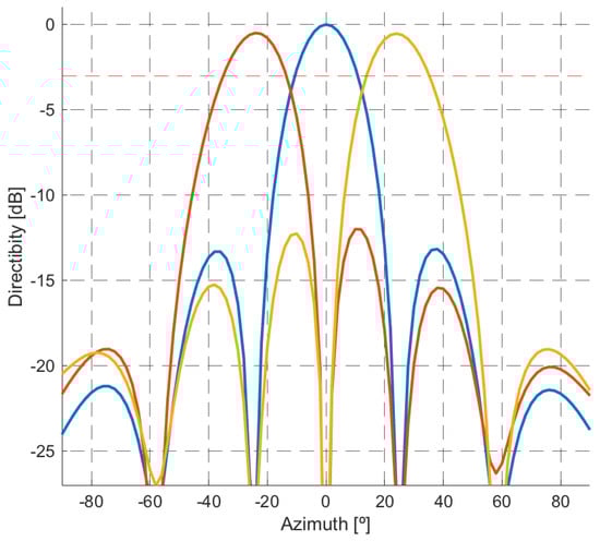 - The orthogonal beams design procedure reduces the contribution to signal power in the current beam of targets whose DoAs are the steering directions of adjacent beams. However, the decrease in gain with respect to the maximum at the intersection points of the beams can be greater than 3 dB, negatively affecting the echoes of the targets in those directions (Figure 4). As the main objective of this first stage of spatial filtering is to improve target echoes SNR to allow their detection, beamforming gain losses should be minimized along the whole coverage area. Therefore, a second set of N − 1 steering angles, , was defined according to the crossing points of the previous orthogonal beams. Both steering angle sets are merged together in a steering vector to continue the design process, .