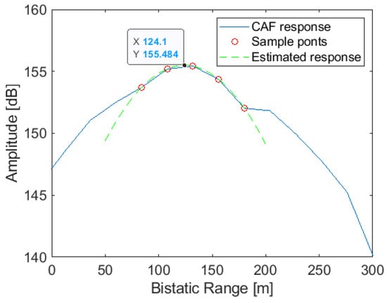 Target’s range estimation by means of 5 points around the maximum. The real target range is 125 m, while the maximum of the CAF is obtained at 132 m. The estimated range with this approach is 124.1 m.