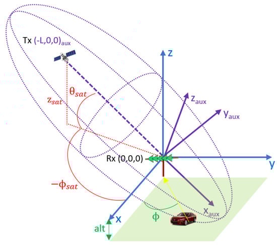 The measured bistatic range (m), defines a three-dimensional ellipsoid of revolution with the GPS satellite and the PR located at the foci. The equation of this ellipsoid is (13) in an auxiliary coordinate system, , which is obtained from the local Cartesian space by a first rotation on the z-axis with an angle , followed by a second rotation on the y-axis according to the satellite’s inclination, . These two rotations place the position of the transmitter at in the auxiliary coordinate system as shown in Figure 6.