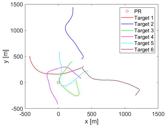 Six different targets with random initial positions around the PR location were simulated. A model with a quasi-constant modulus acceleration vector with independent components in X and Y coordinates was selected as the dynamic model of the targets. Initial velocities and accelerations were randomly selected from typical ground vehicle values.