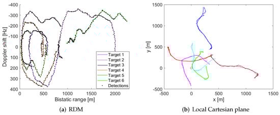 Results for the simulated radar scenario: (a) confirmed detections and associated tracks in the measurement space (range-Doppler); (b) Cartesian space tracking results (+ marker) and reference targets’ path presented in Figure 7 (solid line).