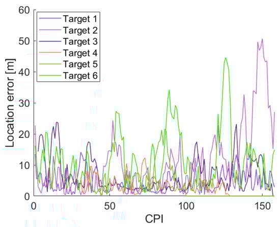 The localization error was also calculated as the Euclidean distance between the estimated track and the actual target location. Figure 9 shows the estimated localization error over the simulation time for the six targets. As expected from Figure 8b, the localization error remains low along most of the tracked trajectories, with larger localization errors appearing at tight turns of the targets and when the distance between the target and the PR increases. However, despite the localization error can be as higher as 50 m at target 2, the average localization error of each simulated target remains low: 4.44 m, 10.76 m, 6.65 m, 2.96 m, 3.09 m, and 11.19 m, respectively.