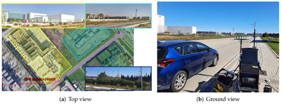 Trials radar scenario: (a) top view with PR location, satellite direction (PRN32), area of interest (green area), cooperative target trajectory from GPS data (purple line), buildings and sport facilities details are shown in pictures with their associated area; (b) ground view of the AoI, cooperative vehicle and PR receiver deployment.