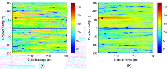 The first result to be described correspond to the detection of a cooperative target in the radar scenario. Figure 11a plots the RDM for the first single element of the surveillance array at CPI = 9. At this instant, the target echo was at 24 m bistatic range and the Doppler shift was −60 Hz, with a CAF level of 118 dB. The target echo shows a range extension with a starting point outside the CAF range limits and an end point at approximately 100 m. This echo extension is explained by the difference between the GPS signal bandwidth (2 MHz) and sampling frequency (25 MHz), and the size of the range bins (12 m).