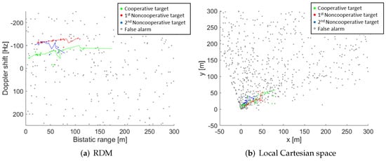 Figure 12b shows the targets’ location estimation on the local Cartesian space centred in the PR receiver and with the North direction following the y-axis. As it was expected from targets’ detections in the RDMs, the cooperative target reaches the higher detection distances from PR location (98 m) due to its movement was performed during the beginning of the acquisition and overpassed the detection coverage. The detection range for non-cooperative targets remains lower (68 m and 55 m) due to their movements along the AoI were carried out at the end of the measurement, and could not overpass the detection coverage before the end of the acquisition.