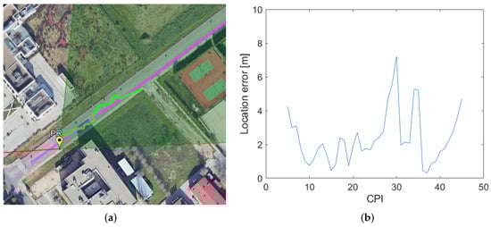 Localization results for a cooperative target: (a) Google Earth view of the cooperative target’s estimated position (green) versus target GPS data (purple); (b) Estimated localization error for the cooperative target.