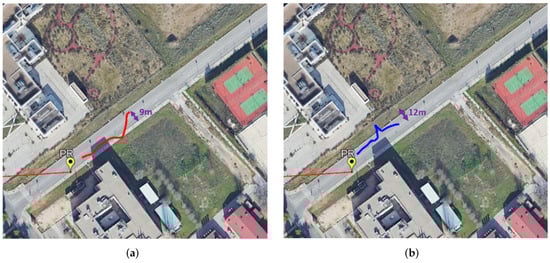 The targets’ location estimations in the local Cartesian spaces were transformed to the geodetic coordinates for easy integration into the Google Earth application. Figure 13a depicted the Google Earth view of the localization results obtained for the cooperative target in comparison with the target’s trajectory from GPS data in the radar scenario. The estimated trajectory is mostly on the road, close to the actual location provided by the GPS data of the cooperative target. The higher estimation deviations are presented in the second part of the trajectory where the target’s SNR decreases and detection failures appear. Target detection and localization start when the target trajectory exceeds the PR position and continues for more than 10 s, reaching a maximum detection distance of 98 m from the PR location.