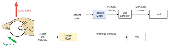 Let us consider a situation in which the human subject is asked to hold an object; according to TCT theory, the gripping force is set in such a way that the difference between the threshold length (established by the physical shape of the object) and the actual length, which is set to be virtually inside the object, is the minimum. The result of this operation is that the object is held using the minimum quantity of gripping force. The same situation was considered from another point of view by Kawato in [29] and is shown in Figure 1. Here, the coordination of reaching and grasping, which allows using the minimum grasping force to prevent slip when lifting an object, was considered the proof of the existence of internal inverse and forward models of the limbs. When the arm grasps an object, the inverse model of the combined dynamics of the arm, hand, and object computes the necessary motor commands from the desired arm trajectory. Such commands are sent both to the arm muscles and to the dynamic forward model, which can predict the future trajectory and establish the grip force necessary to lift it, considering its friction and a safety factor.