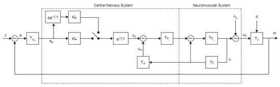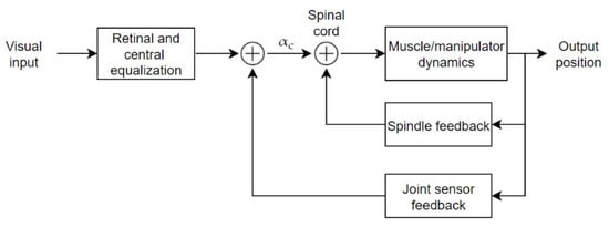 The neuromuscular system dynamics model has been widely investigated in manipulation tasks starting from the early 1960s. Typically, muscles and manipulators are considered to be unique functions. An example of what can be involved in muscle-manipulator dynamics was studied in [43], and a simple block scheme of neuromuscular subsystems is shown in Figure 2. Retinal and central equalization transfer function change according to the considered forcing function forcing function dynamics, as represented by simple gain and delay factors in [43] for a rate stimulus, but change for other controlled elements. The alpha motor neuron command αc is the command input from higher centers to the spinal cord. The change in the average firing rate of the alpha motor neurons involved is proportional to the driving force. The commanded force signal then goes to the muscle/manipulator block, whose dynamics, as previously mentioned, are represented by a unique transfer function that consists of a third-order system with one real root and a quadratic pair plus a time delay: