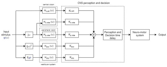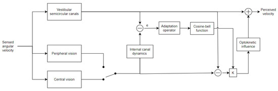Telban and Cardullo proposed a model that captured the perception of rotational motion, parametrized to match the latencies experimentally observed in [67,68]. This model can analyze inputs coming from peripheral and central visual fields and vestibular inputs. The rotational perception model, as represented in Figure 4, provides the computation of the perceived angular velocity, given the actual inputs coming from the two considered sensory systems, where the semicircular canals represent the vestibular one.