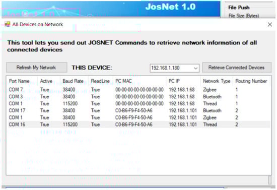 - Next, the requesting PC sends a trigger containing its own information: “#JS|#GAD|#HOST=192.168.1.180:2020,#NET=ZB”. This is an array of four elements from the requesting station #JS, which represents “JosNet” as an initial declaration of identity. #GAD is the second element, which represents “Get All Devices” and retrieves all information from the SPM, which are COM port, network protocol affiliated to that port (displayed as network type), active status of the COM port, baud rate, readline status, and IP and MAC address of PC. The third element is #HOST, which represents the IP address and port number of the requesting/source station. The final element is “#NET”, which represents the requesting/source network type. The source network type from the above example is Zigbee. It is important to note that any trigger without the complete element would yield an error message;