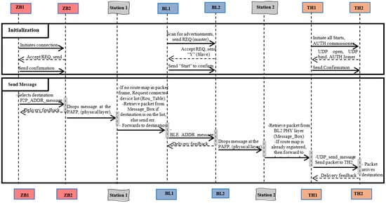 - At point ZB2: For Initialisation, regularly advertises for a connection request (REQ) and accepts REQ by sending “Y”, as well as sending its own device information (PANID, Device ID, channel, and more). For sending a message, packets are received from ZB1 together with information for the target destination, and it is responsible to drop off packets in the PAFP Module. Upon receiving the packet, ACK is sent back to ZB1 to confirm successful message delivery.