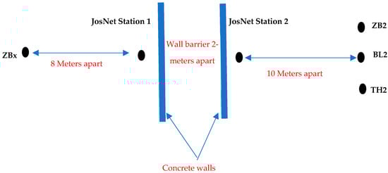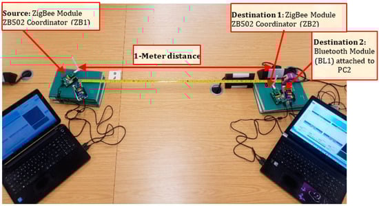 To test the interoperability of both ZigBee and Bluetooth LE network technologies, ZB1 module (source) is connected to PC1, while both ZB2 and BL2 (destinations) are connected to PC2 with the same power source and frequency as previously mentioned. It will be imperative to test their performances at a further distance of 10 m and have a wall barrier. In this case, we position each node with two rooms apart from each other. To determine the average quality of any wired or wireless network, it is imperative to test the integrated network multiple times with varying distances, different packet sizes, and wall barriers.