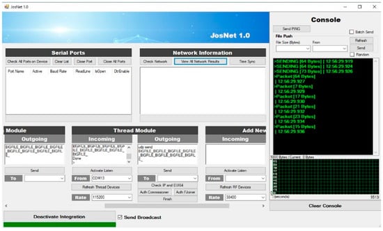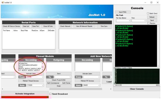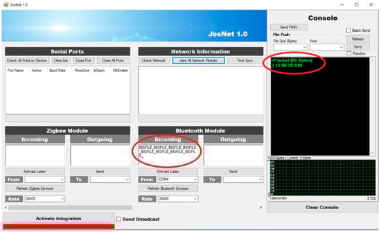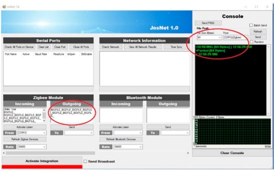 JosNet brokerage application is used to initiate connections and make the integration between Zigbee, Bluetooth, Thread, WirelessHART, and other related network protocols possible, as we will discuss in the next section. To allow interoperability between ZigBee and Bluetooth LE, the “Activate Integration” must be turned on at the receiving (destination) computer (PC2), as shown below in Figure 6. It is necessary to activate Integration to allow the network interpreter to carry out the handing-over process and synchronise packets across every connected network node. For example, when Bluetooth LE sends a message from PC1 (source) to ZigBee on PC2 (destination), “Activate Integration” should be activated on PC2. Timestamp and data sizes are displayed on the console section of JosNet on the receiving PC (in our case, it is PC2).