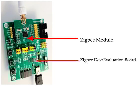 A CC2530 Zigbee module and ZB502 development board used to configure the Zigbee network during the research [75].