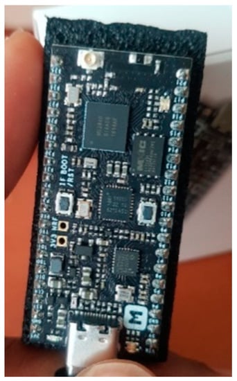 A product from Makerdiary (see Figure 9), the low-cost nRF52840-MDK (Makerdiary Development Kit) is a versatile IoT hardware for low-energy and low-rate 2.4-GHz proprietary wireless network protocols using the nRF52840 system-on-chip [76]. The device is called versatile due to the multiprocessing capabilities of its Nordic SoC across various wireless technologies, including Bluetooth, Zigbee, Thread, ANT, WirelessHART, and other IEEE 802.15.4 network protocols with a 2.4-GHz frequency.